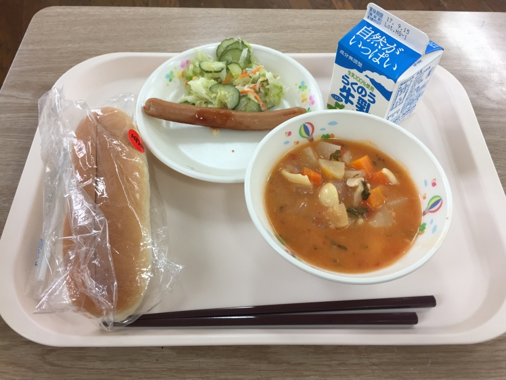 今日は、お洒落な喫茶店に出てくるような洋風のメニューでした。子ども達は、パンの間にたくさん具材を挟み、大きな口を開けて食べていました。肉汁たっぷりの大きなソーセージとトマトソースが抜群に際立つミネストローネに子ども達も大満足の給食でした。
