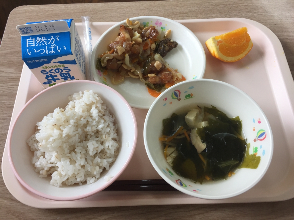 今日の給食に使われているレバーには、鉄分が豊富に含まれています。疲れがたまりやすい運動会の練習期間には、心強い食材です。また、みかんには、体を冷やす効果もあります。しっかり食べて運動会の練習を乗り切ってほしいです。
