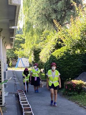 朝から職員室の中や日陰は涼しく感じましたが、外に出て日差しにあたると暑さを感じます。登校班の子どもたちがやってきます。