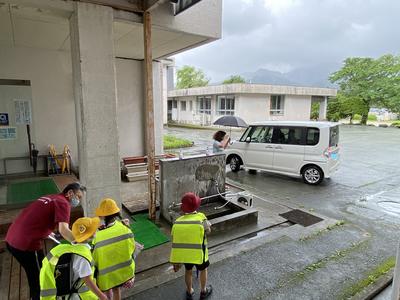 校内の道路が狭く離合が難しいため要所要所に職員が立ち通行を指示しました。時折雨脚が強まる中、先生方は大きな身振りと笑顔で対応していました。
