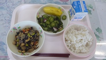 今日の酢の物には、天草産のたこが使われています。たこは有明町の特産品で、たこを広げて干した「ほしだこ」で作るたこ飯が有名です。給食には、きゅうり、わかめといっしょにあえた酢の物で登場。さっぱりとしていて、おいしく食べることができました。ひじきたっぷりの磯煮とあわせて、海の幸メニューでした。