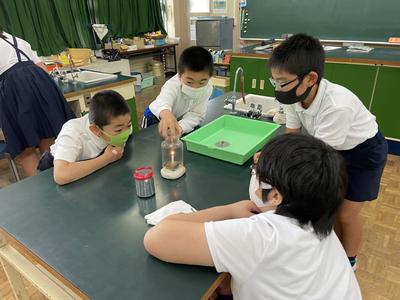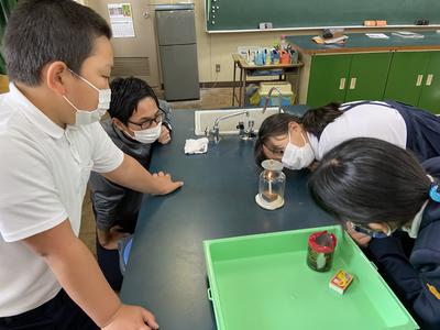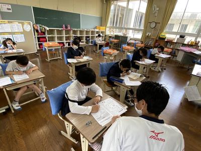こちらは、6年生の理科。これもまた、これまでの登校日では見られなかった風景。理科室で、しかも実験。みんな楽しそうに実験をしていました。