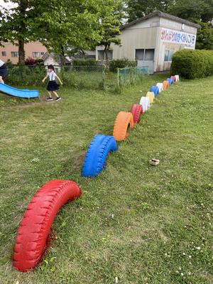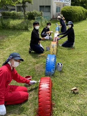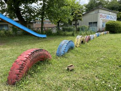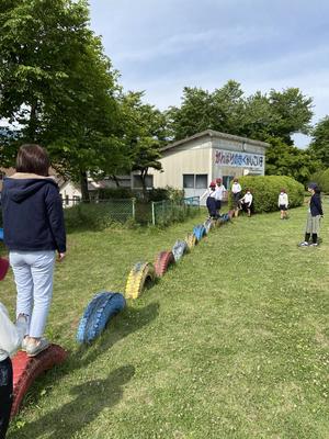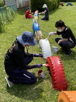 昼からは、校長先生と担任外の先生方とタイヤのペンキ塗りをしました。この前、5年生がタイヤリレーをしている時に「タイヤすべるんですよ~」と言っていたので、急きょタイヤ塗りをすることにしました。やっぱりチームでする仕事は楽しいし、塗り直したタイヤが緑に鮮やかに映えて気持ちいい!学童の子どもたちも片付けのお手伝いをしてくれました^^!