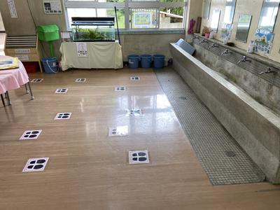 6月1日の再開に向けて今日から始まった慣らし登校。今日からは5日間連続の登校になります。トイレの前や水飲み場には、校長先生と保健室の先生が準備された足形が。子どもたちも、ソーシャルディスタンスを意識しての生活することができました。また、今日は給食がないためおにぎり。みんなあっという間に食べ終わったようです。おにぎりづくりお世話になりました。