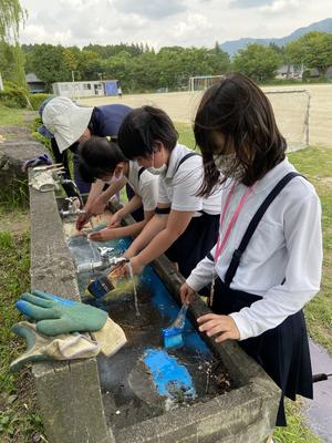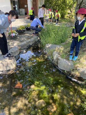 職員玄関横のビオトープの池を覗いている先生方。昨日、5年生と3年生の兄弟と保護者の方が、この池にさわがに、やご、小魚などをプレゼンとしてくれたのです。