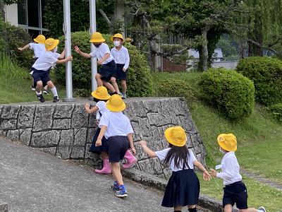 休み時間、黄色い帽子の1年生が掲揚台の周りに集まって鬼ごっこを楽しんでいました。まるで庭先でひよこが遊んでいるようでした。