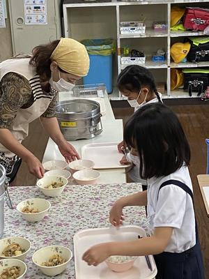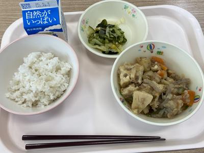 今日は1年生にとって人生初(?)の小学校での給食でした。せっかくなので写真で紹介します。