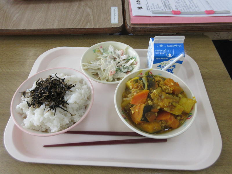 今日は、牛乳と、春においしいキャベツをたっぷり使ったカレーライスでした。キャベツを細く切って、しっかり炒めてあったので、とてもおしかったです。キャベツには、栄養素のビタミンCが、多くふくまれていて、特に固い芯の部分に多いそうです。