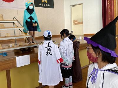 担任の先生も含め土曜日がハローウィンと言うことで仮装しての射的。段ボールでつくった的に弓矢と割り箸てっぽうでゴムを飛ばして的あてをしていました。