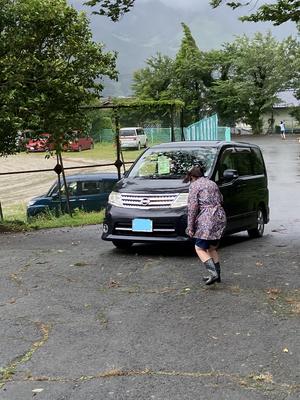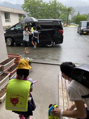 校内の道路が狭く離合が難しいため要所要所に職員が立ち通行を指示しました。時折雨脚が強まる中、先生方は大きな身振りと笑顔で対応していました。