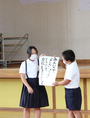 今回の人権集会では、各学級から人権目標の発表がありました。どの学年も楽しい学校生活を送るために、友達を大事にすることや思いを伝え合うこと、相手のことを考えた言葉や名前を大切に呼び合おうということを発表していきました。