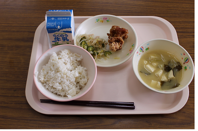 今日はキムタクごはん。「キム」はキムチ、「タク」はたくあんのことで、つけもののまぜごはんになります。今日はキムチとごぶづけ(大根のつけもの)が入っています。子どもたちにも人気のメニューのひとつです。もともと長野県塩尻市の給食に出されたメニューで、子どもたちが長野県名産の漬け物をあまり食べてくれないということで、給食センターの栄養士さんが豚キムチに漬物を混ぜたことが始まりです。以来、口コミで広まり、全国の学校給食に取り上げられるメニューになったそうです。