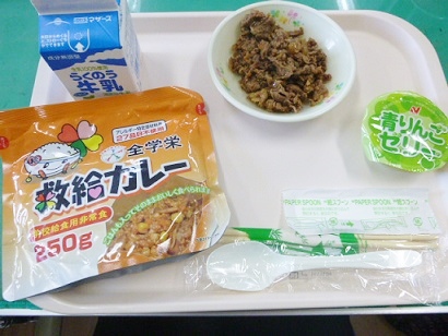 2学期初めての給食です。9月1日が『防災の日』ということで、今日の給食は非常食の「救給カレー」でした。