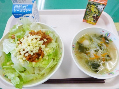 本日の給食です。サラダは、ごま油の風味がキャベツの甘さを引き立てていました。いわしに含まれている栄養素は「骨粗鬆症」を予防する効果があるそうです。ぜひ、ご家庭でもいかがですか。