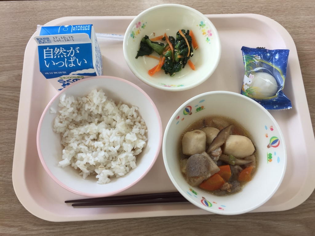 今日の吹き寄せご飯は、秋の味覚を盛り合わせたとても彩り鮮やかな仕上がりになっています。今日は、食欲の秋をしっかり楽しみましょう。
