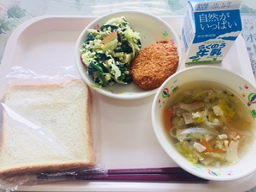 今日のパンはメロンパン!楽しみにしている子が多かったです。メロンパンは日本発祥の菓子パンです。メロンパンの名称の由来は、見た目がマスクメロンに似ているから、メレンゲパンがなまってメロンパンになった、等諸説あるそうです。