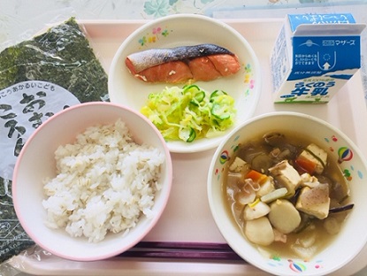 今日は、学校給食記念日です。戦後食糧難による児童の栄養状態の悪化を背景に学校給食の再開を求める声が高まりました。その時、アメリカのLARA委員会(アジア救済公認団体)から、給食用物資の寄贈を受けることになり、昭和21年12月24日東京の永田町小学校で贈呈式が行われました。このことにちなんで、当時の文部省によって定められた「学校給食感謝の日」というのが「学校給食記念日」の起源です。12月は冬休み中のところが多いので、1ヶ月後の1月24日を学校給食記念日として、今日から1週間全国学校給食週間としています。