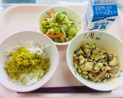 平成27年の調査によると、国産大豆が多く使われている製品は、順に(1)豆腐、(2)納豆、(3)煮豆総菜、(4)味噌醤油だそうです。小学校では3年生の国語に「すがたをかえる大豆」というお話があります。子ども達は、このお話を読み、大豆がいろんな食品の原料になることも学ぶ事ができます。最近は低カロリーで腹持ちの良いおからを使ったスイーツのレシピも沢山見かけます。ご家庭でも子ども達と大豆食品を探してみてはいかがでしょうか♫