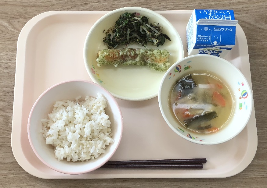 今日も、南阿蘇西小学校の5年生が育てたお米を使って、白ご飯をつくっています。天玉揚げの衣には天玉を砕いた物を使用しており、歯ごたえのある食感をだしています。また、あおさ海苔も衣に含まれているので風味が食欲をそそる一品になっています。
