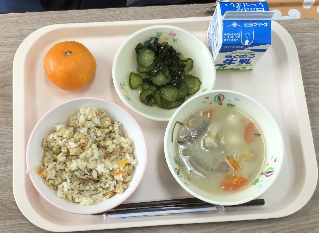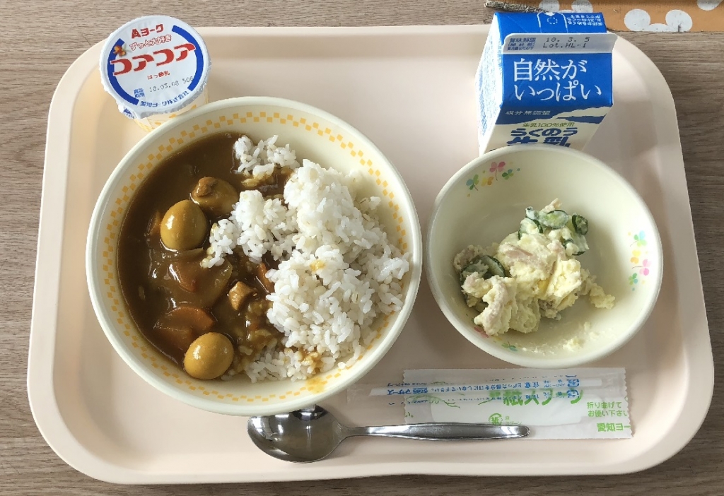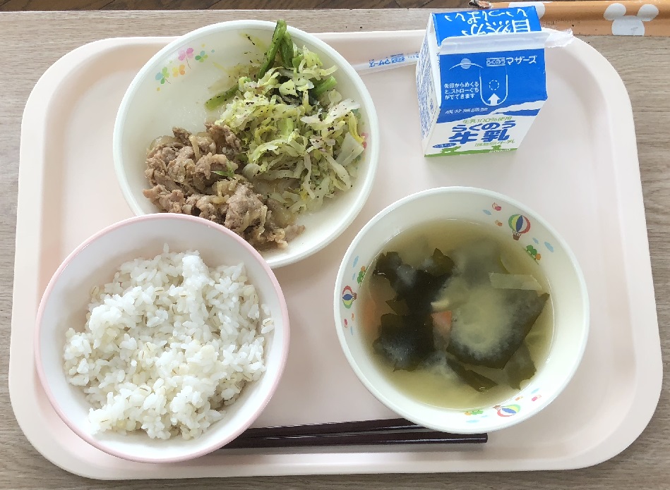 豚肉は中国で古くから食べられており、日本で食べられるようになったのは、明治時代からだそうです。豚肉は牛肉の10倍のビタミンB1が含まれています。ビタミンB1は、イライラを防ぎ、疲れた体を元気にする効果もあり、脚気(かっけ)の予防にもなります。今日はゆかり和えに小松菜が入り、いつものゆかり和えよりもおいしさが増しているようです。