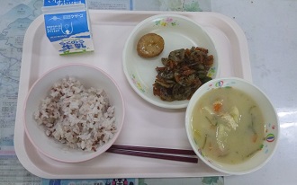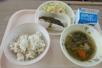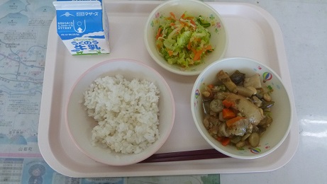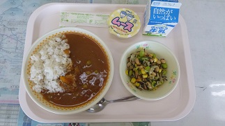 今日のサラダには、だいず、えだまめ、ちりめんじゃこ、ひじきが入っています。豆類や海藻類には、ビタミン、ミネラル、食物繊維などの栄養が多く含まれています。縮緬雑魚も入っているのでかみごたえもあります。ゆっくりかんで食べることで、消化にもよく、食べ物の味をしっかり味わうことができます。固いものもやわらかいものも、しっかりかんでたべるといいですね。