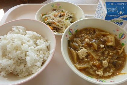 今日は旬の野菜、「なす」を入れたマーボー豆腐でした。なすを入れることでいつものマーボー豆腐よりもとろみが出ます。