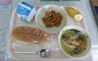 今日は、チリコンカンをコッペパンにはさんで食べます。チリコンカンはアメリカ発祥の料理で、テキサス州の州の料理に指定されているそうです。ひき肉と玉ねぎ、トマト、水煮の豆、チリパウダーを煮こんで作ります。給食では辛味が抑えてあり、子どもたちもコッペパンからはみ出そうなほどたっぷり乗せて、おいしく食べていました。