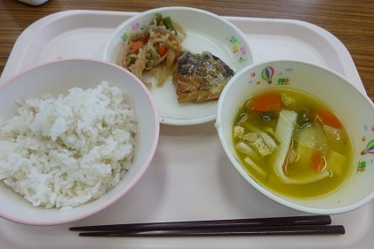今日の給食には、ほうとうの中にかぼちゃ、さばのゆずみそにの中にゆずが入っていました。元気に過ごせますようにという給食に込められた思いを感じながらいただきました。