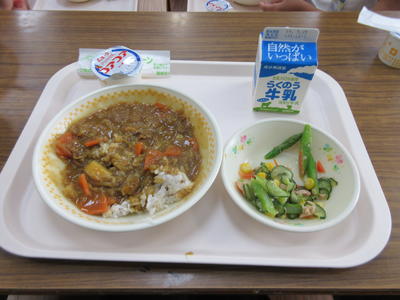 今日は、牛乳と、春においしいキャベツをたっぷり使ったカレーライスでした。キャベツを細く切って、しっかり炒めてあったので、とてもおしかったです。キャベツには、栄養素のビタミンCが、多くふくまれていて、特に固い芯の部分に多いそうです。