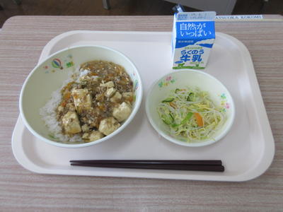 今日は、マーボーどうふどんを、麦ご飯にのせて食べる「マーボーどうふどん」でした。