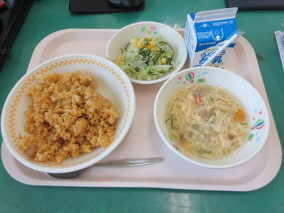 スパイシーピラフは、ピリッとからいカレー粉が入っています。ピリッとした辛さ、スパイシーな香りは、少し疲れた時でも、食欲がわいて食べやすいです。その証拠に、中松小は運動会がまだまだ先なので、子どもたちは通常の生活を送ったのですが、「先生!ピラフふやしたいです!」と、食缶の前に列をつくって並んだほど、ふやしたい人続出でした。