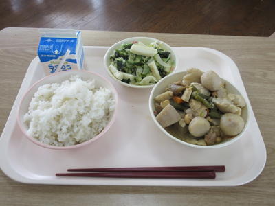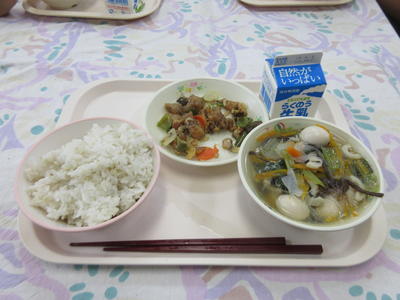 イカは、種類がとても多く、日本近海には、70~80種類のイカがいると言われているそうです。今日の酢みそあえに使ってあるイカは、「むらさきイカ」でした。イカは、歯ごたえがあり、よくかんで食べることで、いろんな味がわかるようになります。給食では、みそ味のあえものを出すことは、少ないそうですので、「好きな人が増えるといいなあ」という思いを込められて調理員さんが作られました。