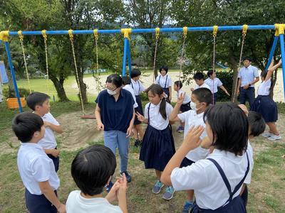 そして、同じ5年生、先日全員が揃わなかったためにできなかった記念誌のクラスの撮影を行いました。場所は、ブランコの前。写真は、だれがブランコに乗って写るかのじゃんけんの様子です。じゃんけんに勝って見事ブランコに乗って写る栄誉を手にした2人!