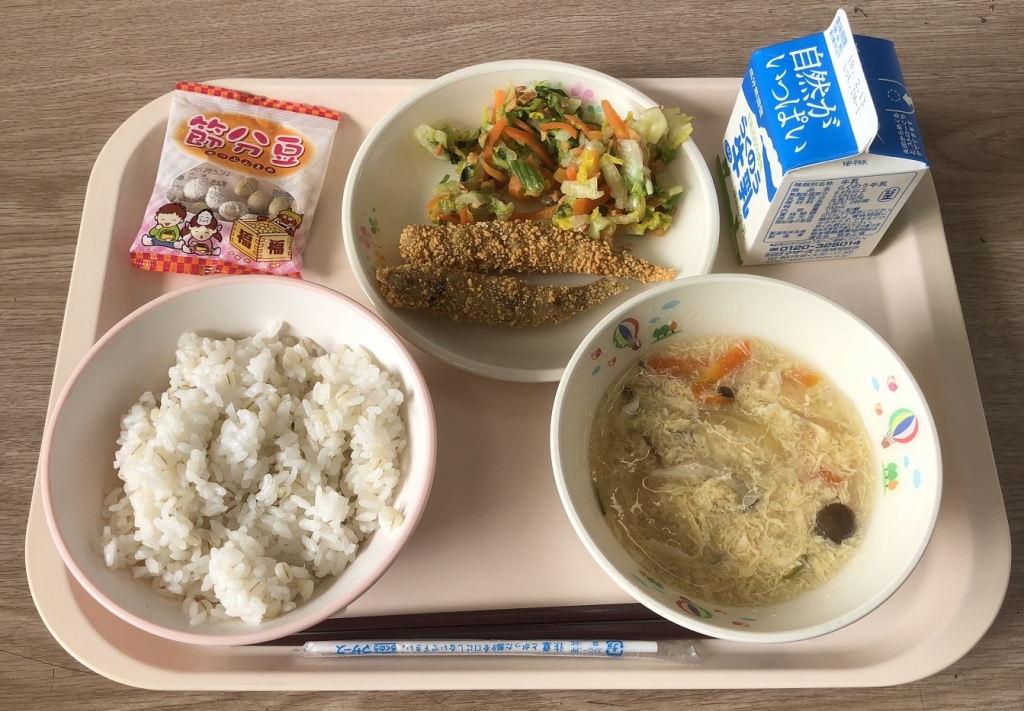 明日2月3日は、節分の日です。今日は節分にちなんで節分豆を給食に出しています。節分は、歳の数だけ豆を食べるだけでなく、鰯の頭やヒイラギの葉を門の所にお守りとして挿しておく風習もあります。「悪魔を滅する(魔滅=まめ)」という漢字を通じて1年間健康に過ごすという意味があるそうです。