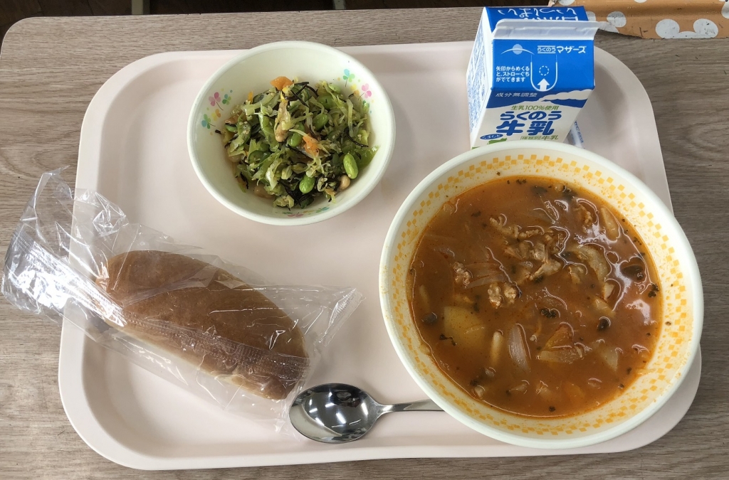 ブレゼーを日本語に訳すと「蒸し煮」と表現される調理方法です。野菜・肉・魚料理に使われることが多いそうです。食べ物がつかる程度の水を入れて、汁気がなくなるまでじっくり蒸すように煮るそうですが、本日の給食ではスープのようにアレンジしてあります。豚肉、野菜がたくさん入っていて栄養満点です。美味しくいただきましょう。