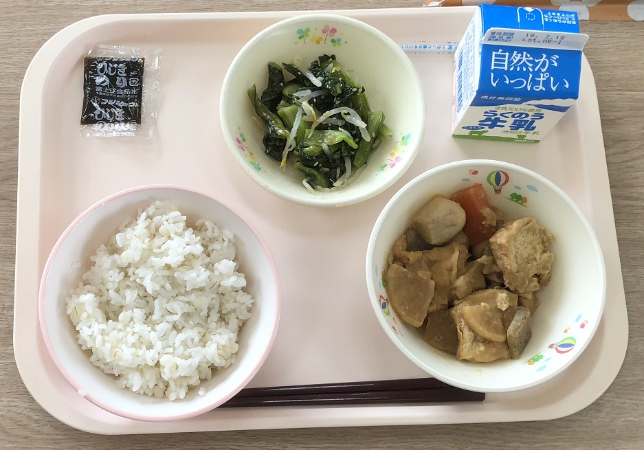 今日の味噌おでんは、昆布と鰹節で出汁を取り、厚揚げ・卵・ちくわ・里芋・こんにゃくと一緒に40分以上煮込んでおり、味噌の風味がひときわ際立っています。野菜やこんにゃく等の食材は、体の調子を整える働きをしており風邪予防にも最適です。今日の欠席の数は0、全校児童が無欠席、全員登校できています。あつあつのおでんを食べて、大寒波をみんなで乗り越えましょう。