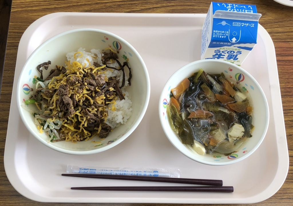 本日から韓国の平昌で、冬季オリンピック・パラリンピックが開催されます。それにちなんで、今日は白水給食センターオリジナルビビンバが給食に出ています。一般的なビビンバは、石鍋にご飯を入れ、その上にぴりっと辛い焼き肉と野菜のナムルをのせて焼き、熱々に焼けたところを混ぜ合わせて食べる料理です。給食のビビンバでは、赤牛が使用されています。韓国料理を食べて平昌で頑張る選手の皆さんを応援しましょう。