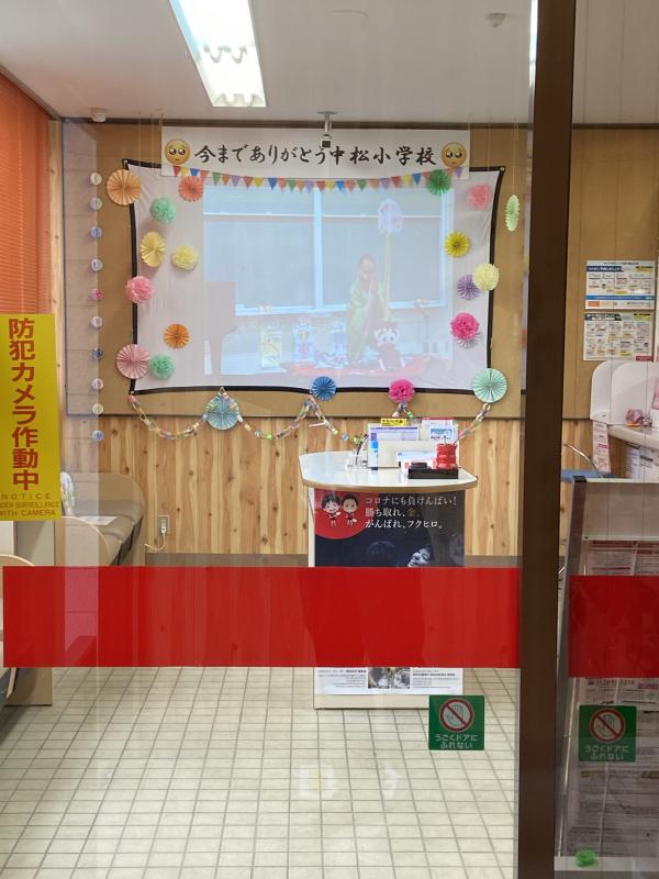 郵便局の入り口から撮った写真です。入り口の正面に「ありがとう中松小学校」の文字が。これは、先週末、本校の保護者でもあられる局員の方が、「閉校記念として郵便局でも学校のために何かしたいと局長が言っています」ということでお話に来られ閉校記念誌に掲載される予定の写真を上映していただくことになったのです。