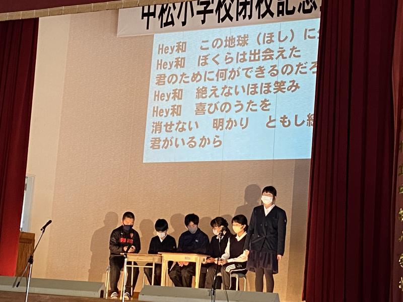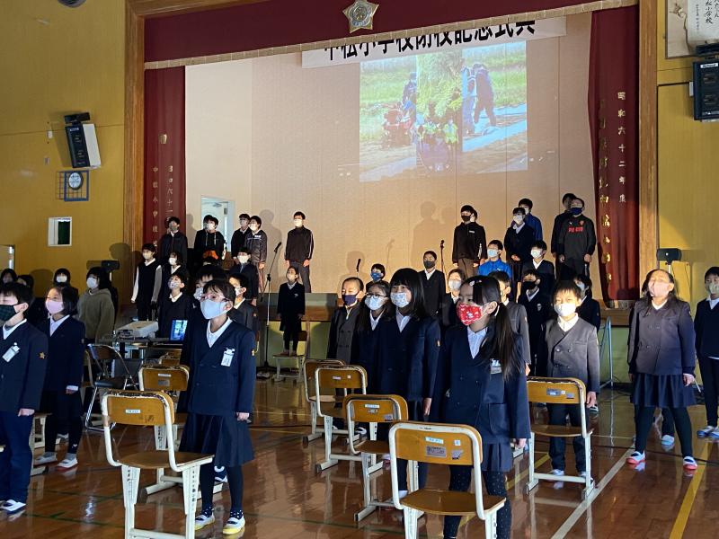 最後は、映像とともに「ふるさと」の合唱と校歌斉唱。