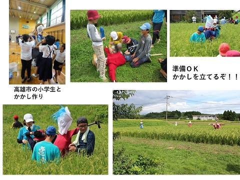 9月4日水曜日に、5・6年生と保護者の方と一緒にかかしを設置しました。このかかしは、6月18日に台湾高雄市の小学生との交流会で、片言の英語とジェスチャーで仲良く協力して作りました。