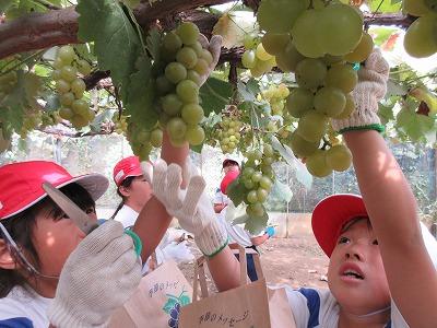 10月15日(火)、本校に在籍する児童の祖父母の方のご厚意でぶどうがりを体験させていただきました。中には初めてぶどう狩りを経験した子もおり、はさみでぶどうの蔓をパチリと切ってぶどうを手にすると大喜び!「ふくろに入るしこ、取って入れていいよ~」と言われ、袋いっぱい取って入れていた子どもたちした。教育会長もご夫婦でお手伝いに来てくださいました。本当にありがとうございました^^!