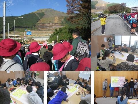 10月29日に南阿蘇の小学校6年生が全員集まり防災教育合同学習会がありました。役場に集合して、地震で崩落した阿蘇大橋周辺の現状を見に行きました。役場の職員の方が、阿蘇大橋について、橋は交通の要だったこと、それがなくなったら向こう側まで行くのに時間がかかったこと、崩れた山は大きな石があっちこっちにあり、いつ落ちてきてもおかしくないような状態だったので、大型重機を遠隔操縦しながら石や倒木を取り除いたことなど話されました。また、道路の中央線が切れて約1mぐらいずれているのを見て子どもたちは驚き、地震の怖さを実感したようでした。そのあと役場に帰ってグループごとに、見学しての感想、これから備えておくべきことを話し合いました。どの班も、活発に意見が出ました。各班の代表として3つの班が発表しました。