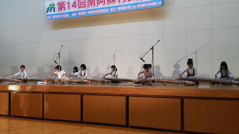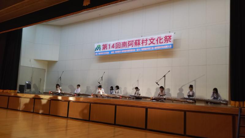 先日の南阿蘇村文化祭の11月2日のステージ発表で、中松小学校の放課後子供教室に参加している中の1,2,3年生10名が琴の演奏を披露しました。演奏した曲は、「夕焼けこやえ」「一番星みつけた」「お月さま」の3曲です。琴の練習は7月から毎週木曜日に行っていました。琴の音色は本当に美しく、息のぴったりあった演奏でした。子どもた ちの演奏の途中から、演奏に合わせてお客さんから歌声があり、会場は あたたかい雰囲気に包まれました。