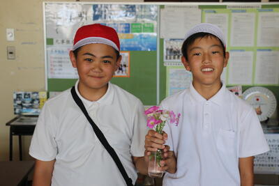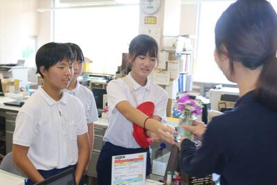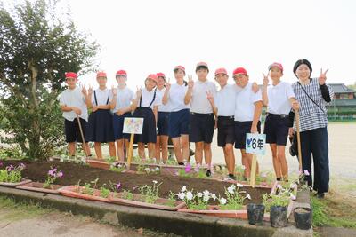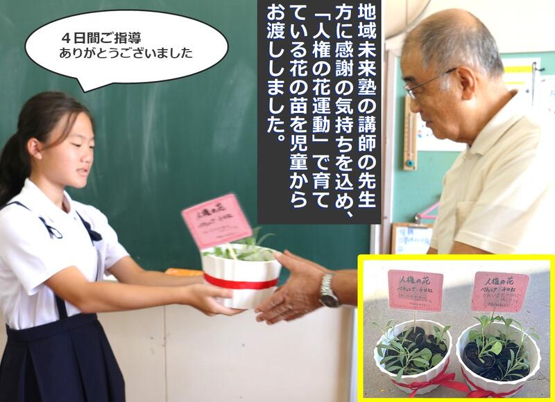 地域未来塾の講師の先生方に感謝の気持ちを込め、育てている花の苗を児童からお渡ししました。(7/25)