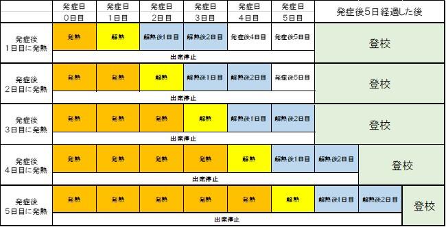 全国的にインフルエンザが拡大しており、上天草市内の小中学校でも感染が広がりつつあります。学校では引き続き感染防止に努めてまいりますが、ご家庭でも十分にご注意ください。もし、お子様がが感染された場合は、下記の早見表と添付資料をご確認のうえ対応をお願いします。不明な点があれば、遠慮なく学校へご連絡ください。