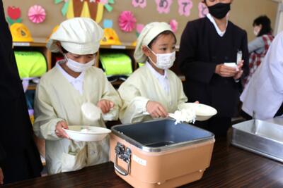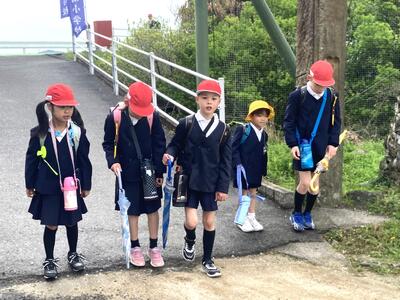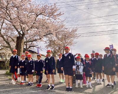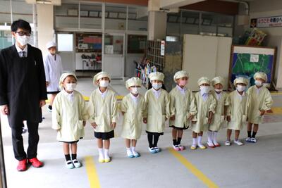 新1年生が黄色い帽子をかぶり、登校班で元気よく登校してきました。学級では挨拶の仕方や学校の決まり事などを学んでいました。また、早速給食も始まりまり、エプロンを着て9人全員で力を合わせての給食準備を行っていました。初めてばかりのことでしたが、とても頑張っていました。