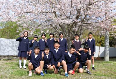 新6年生は桜の花の前で… 1年間中南小をしっかりとリードしてください!