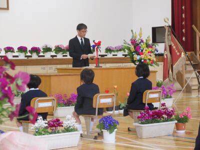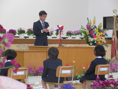 色とりどりの花が咲き誇る春爛漫の今日、9名の新入生を迎える入学式を行うことができ、大変うれしく思います。明日から中南小の1年生となる9名の児童をの無限の可能性を、最大限伸ばせるよう、職員一丸となって誠心・誠意、力を合わせ、日々の教育活動を実践していきます。また、大変ご多様な中に、上天草市総務課長 海崎様を始め、多くの御来賓の皆様に御臨席いただいたことに、心より感謝申し上げます。