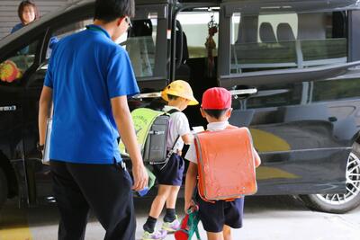 ・職員外で地区と児童名を確認してトランシーバーで室内の職員に伝えます。