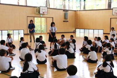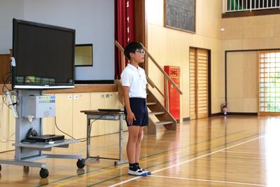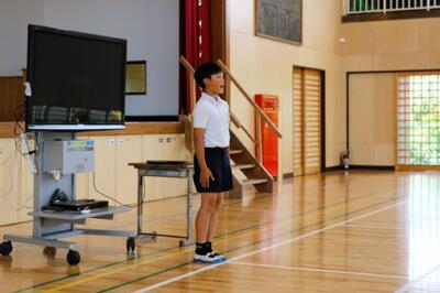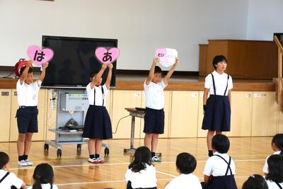 プール掃除後、少しずつ水を入れ、本日プールが満水となりました。来週からのプールでの授業を前に、「プール開き集会」を行いました。 私からプール掃除の画像をもとに5.6年生の頑張りを下級生に紹介し、命を守るための行動を話しました。体育委員会からは合い言葉「は・あ・と」についての説明や「誓いの言葉」がありました。プールでの決まりごとや命を守り安全に学習するための誓いを全員で共有することができました。